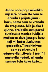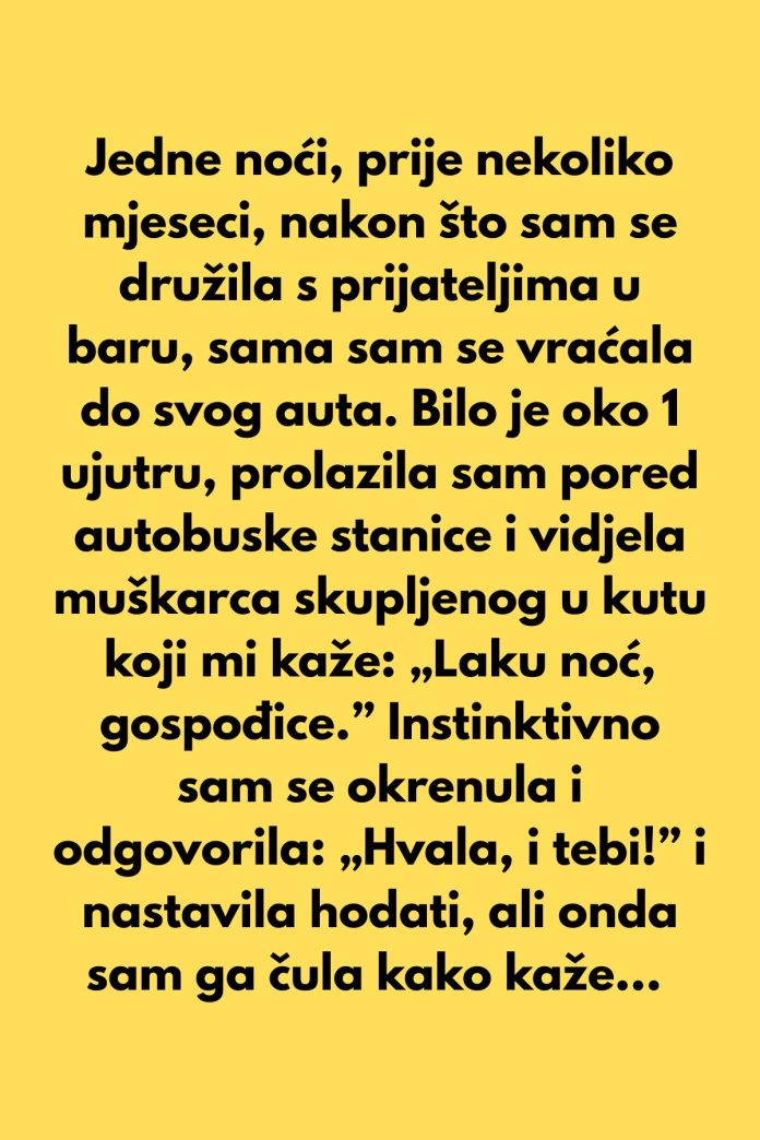 - Bilo je oko 1 sat ujutro, ona je prolazila pored autobuske stanice kad je začula glas nepoznatog muškarca. “Laku noć, gospođice”, rekao je on, a instinktivno je odgovorila sa “Hvala, i tebi” i nastavila hodati. Ali, onda je začula nešto što ju je zaustavilo: “Hvala što si odgovorila, niko nikada ne odgovara. Svi me samo ignorišu.” Te reči, izgovorene u mraku, naterale su je da zastane i okrene se, jer je primetila duboku usamljenost u njegovim rečima.