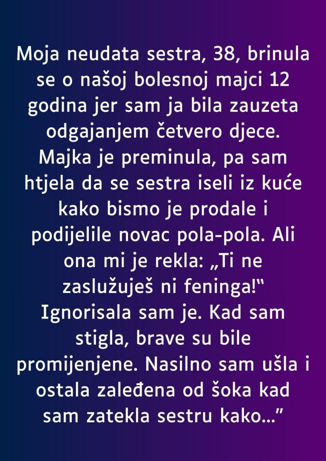 Kada je odlučila prekinuti šutnju i iznijeti istinu, nije znala kakvu reakciju može očekivati. Ipak, ono što je uslijedilo bilo je šokantnije od svega. Umjesto ljutnje ili tuge, druga strana je reagovala mirno, gotovo ravnodušno. Otkriveno je da je cijela situacija bila smišljena kao provjera odanosti. U tom trenutku, postalo je jasno da se nije radilo o nesporazumu, već o svjesnoj zloupotrebi moći.